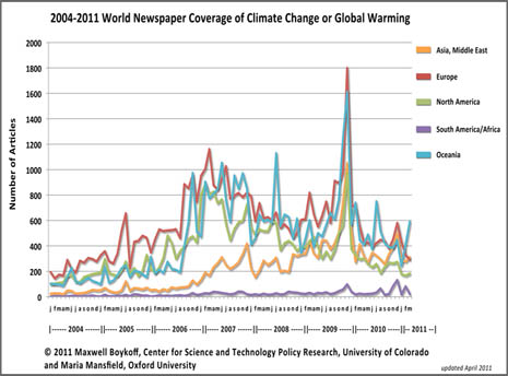 3. Really interesting. It certainly seems possible to argue that the reason that climate scepticism has achieved such prominence in the last year or so is that the wider issue has diminished in terms of popular attention while the sceptics, spurred on by ‘climategate’ and the ‘failure of copenhagen’, have become more vocal. I guess there’s also a potentially quite complicated feedback between the two things.